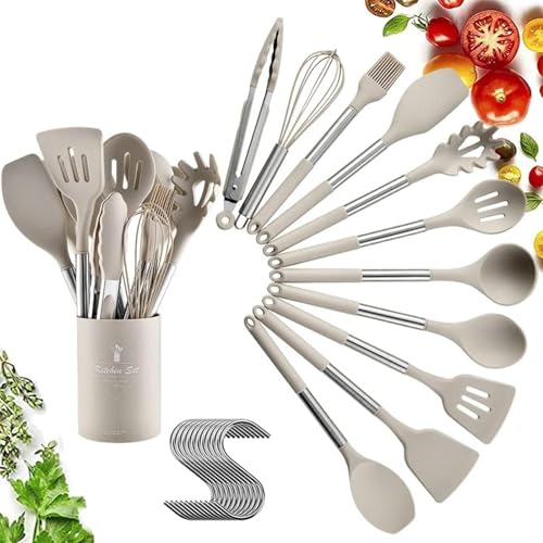 Generic - طقم أدوات مطبخ استانلس ستيل 304 مع مقابض سيليكون حراري وهولدر لتوزيع وتنظيم أدوات الطهي اليومية بسهولة وأمان