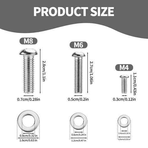 - 3 مقاسات: البراغي الخاصة بنا لها 3 مقاسات: M4 (1.1x0.3 سم/0.43x0.12 بوصة), M6 (2.7x0.5 سم/1.06x0.2 بوصة) و M8 (2.8x0.7 سم/1.1x0.28 بوصة). يرجى التحقق من هذه المقاسات بعناية قبل الشراء.