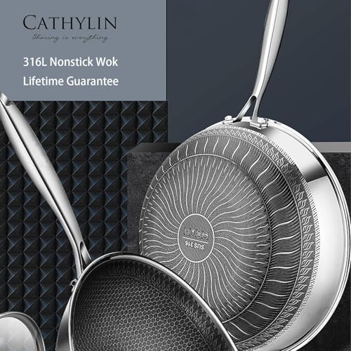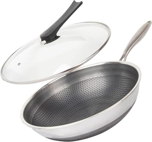 Generic - مقلاة ووك ستانلس ستيل 316L 12.5 انش بتصميم خلية نحل غير لاصقة مع غطاء، مقلاة بمقبض يبقى باردا، خالية من حمض بيرفلورو الاوكتانويك مناسبة للحث والسيراميك والكهرباء والغاز