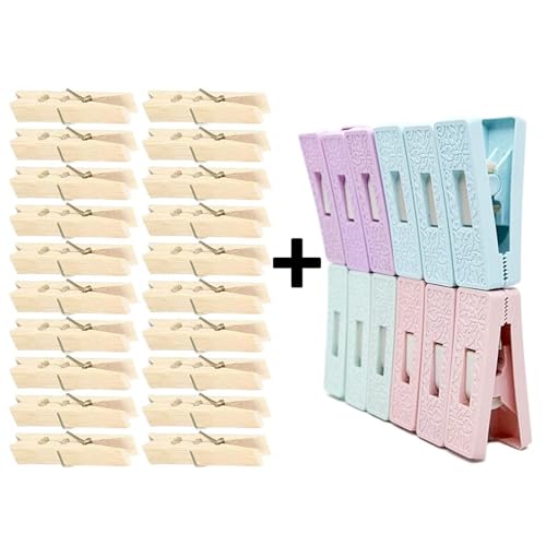 Generic - 32 مشبك غسيل | 12 مشبك بلاستيكي متين + 20 مشبك خشبي صلب وسحاب مجلفن بقبضة قوية مضادة للصدا للملابس | مجموعة مشابك متعددة الاستخدامات وملاقط ملابس | مشابك غسيل