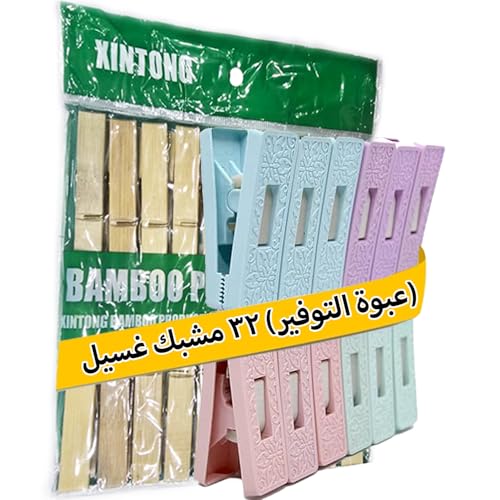 - ✔ طقم شامل 32 مشبك يضم 20 مشبك خشب + 12 مشبك بلاستيك قوي لتلبية احتياجات الغسيل اليومية.