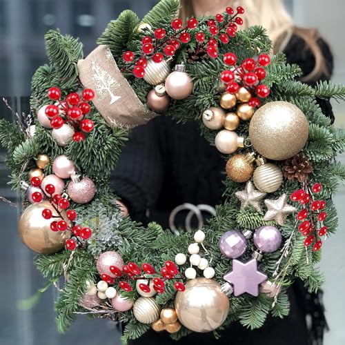 - مظهر واقعي: تتميّز حبات التوت الأحمر بأنها زاهية وواقعية للغاية تشبه الطبيعية تمامًا، ويمكن استخدامها في عدة مواسم احتفالية بفضل جودتها العالية، اللون الأحمر لامع ومثالي مع بريق أنيق لا تشوبه شائبة، مما يجعلها مناسبة لأي مكان: على مائدة الكريسماس كقطعة مركزية أو لتزيين أماكن الجلوس أو في الأكاليل والسلاسل الديكورية أو على شجرة العيد بل وحتى في تنسيقات الزهور الاحتفالية في الحمام أو غرفة الضيوف.