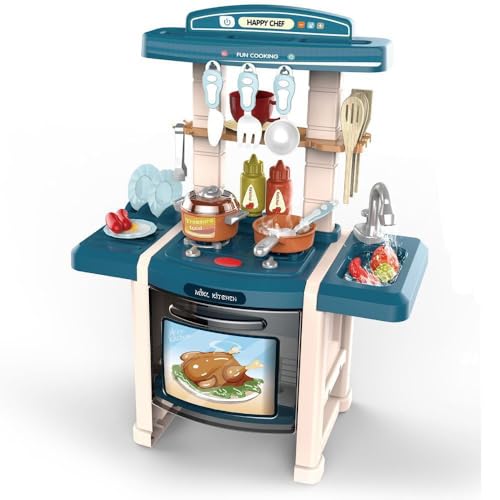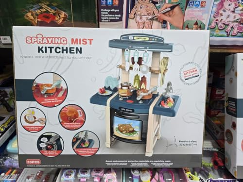 Generic - مجموعة مطبخ كاملة مقاس 65 سم مكونة من 33 قطعة، اواني ومقالي واواني وحاويات طعام بلاستيكية تصدر صوت وضوء وبخاري وصنبور مياه وفرن تشبه المطبخ الحقيقي