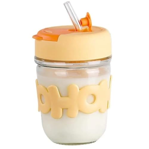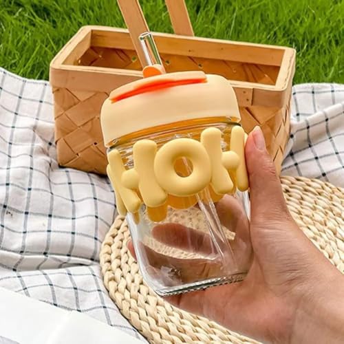 Generic - مج زجاجى 350 مل مع ماصة زجاجة مياه رياضية+ شاليمو مزينة بحروف عصرية للاستخدام الخارجي لون اصفر. الزجاج البورسليكات