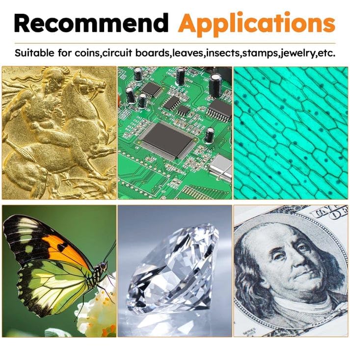 - استخدامات متعددة: مثالي لإصلاح الهاتف المحمول وفحص المجوهرات وإصلاح الساعات وفحص جمع العملات المعدنية وغيرها من الأعمال الدقيقة التي تتطلب تكبيرًا مفصلاً