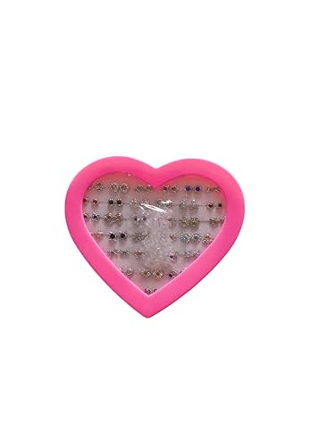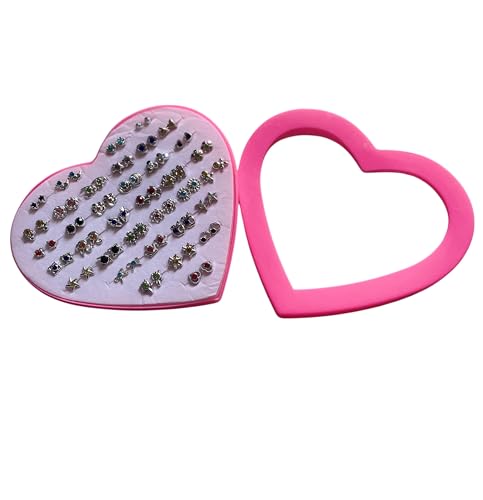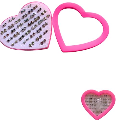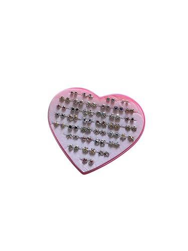 Generic - مجموعة أقراط فضية للأطفال،36 زوج، تصاميم متنوعة مع كريستال وأشكال قلوب ونجوم، علبة قلب وردية