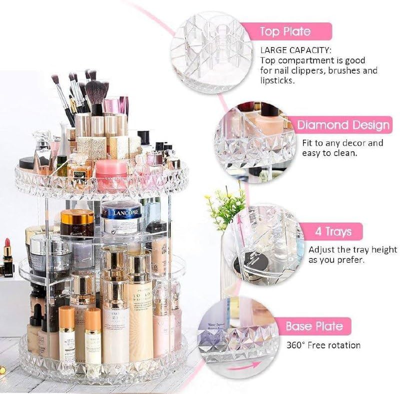 - دوران سلس 360 درجة - مصمم للدوران بالكامل لسهولة الوصول إلى جميع مستحضرات التجميل والعناية بالبشرة ومستلزمات التجميل دون البحث أو الفوضى. يبقى كل شيء مرئيًا وفي متناول اليد. أرفف قابلة للتعديل لجميع الأحجام - تتميز بطبقات قابلة للتعديل قابلة للتخصيص لتناسب العناصر ذات الارتفاعات المختلفة، من أحمر الشفاه والفرش إلى زجاجات العناية بالبشرة والعطور الطويلة. تصميم موفر للمساحة بسعة كبيرة - يحمل مجموعة متنوعة من مستحضرات التجميل في منظم واحد مضغوط، مما يساعد على الحفاظ على منضدة الزينة أو خزانة الملابس أو منضدة الحمام أنيقة ومنظمة.