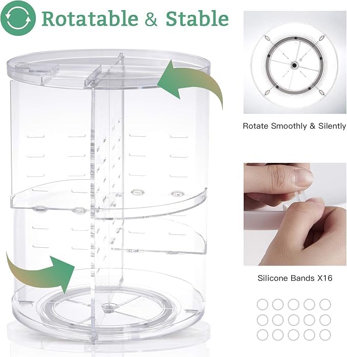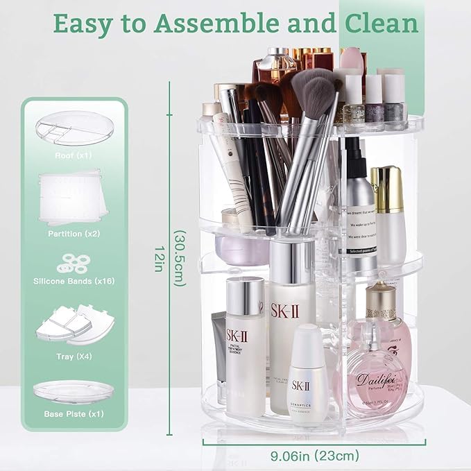 - منظم دوار 360 درجة وسعة كبيرة - يشغل مساحة صغيرة جدًا من سطح الطاولة بينما لا يزال قادرًا على تخزين الكثير من مستحضرات التجميل الخاصة بك. يمكنها حمل ما لا يقل عن 30 فرشاة مكياج و20 منتج للعناية بالبشرة وغيرها من الملحقات بما في ذلك أحمر الشفاه وطلاء الأظافر ومحدد العيون والمزيد من مستحضرات التجميل.