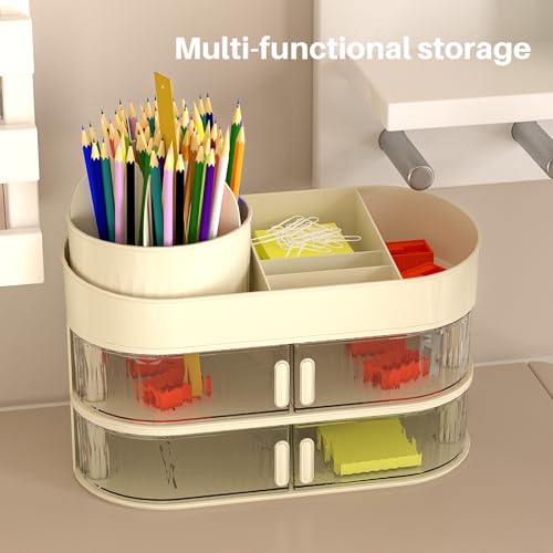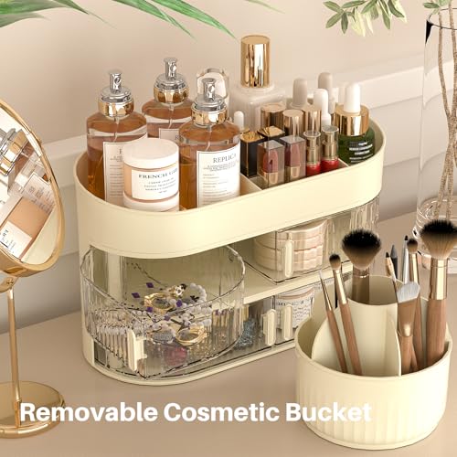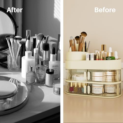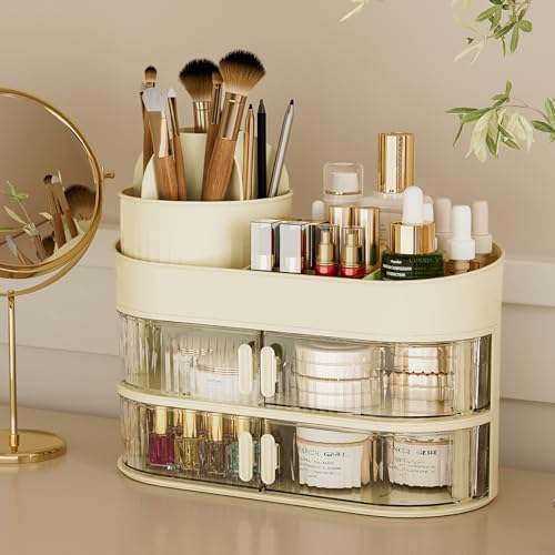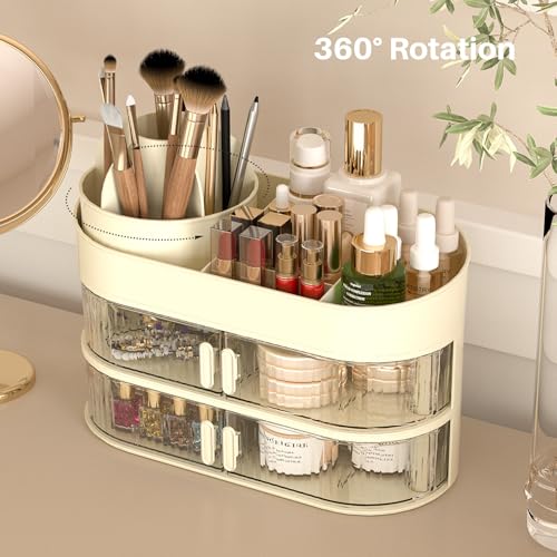 Fillfulfun - منظم تخزين مكياج دوار 360 درجة لمستحضرات التجميل، حافظة عرض مستحضرات التجميل بغطاء شفاف مع صندوق تخزين من طبقتين وصندوق تخزين للفرشاة، مع حامل فرشاة، حقيبة عرض مستحضرات التجميل القابلة للتكديس