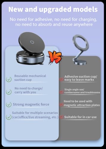 - 【قوة شفط استثنائية】يتميز هذا الحامل بسطح مغناطيسي وقوة شفط بالفراغ مما يمنحه قدرة التصاق عالية جدًا، ويجعله خيارًا متميزًا كحامل للموبايل.