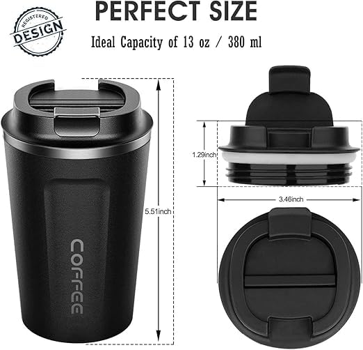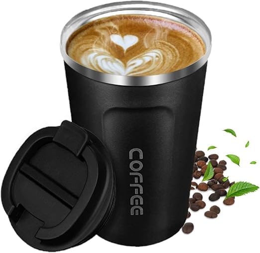 Generic - كوب حراري معزول قابل لاعادة الاستخدام مصنوع من الستانلس ستيل مع غطاء مانع للتسرب وصديق للبيئة، للمشروبات الساخنة والباردة والقهوة ومناسب للسفر - 380 مل (اسود)