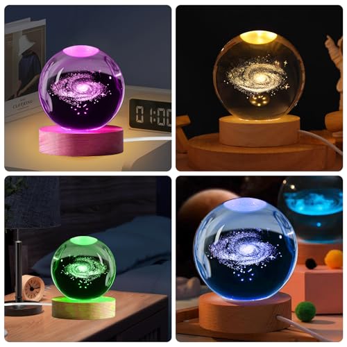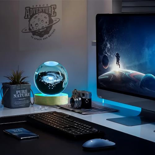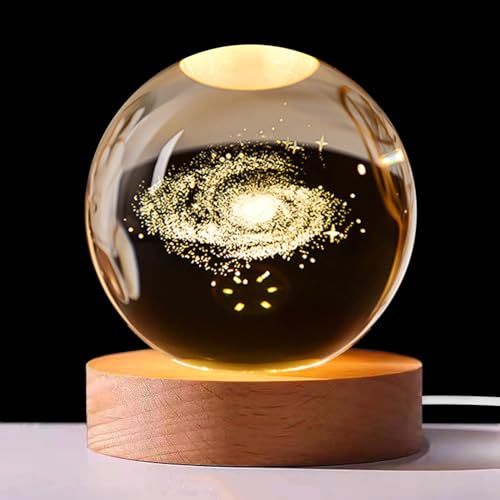 BYZESTY - مصباح ليلي بتصميم كرة كريستال ثلاثية الابعاد 8 سم زجاجية مجرة درب التبانة كوكب ثلاثي بمنفذ USB سماء مرصعة بالنجوم مبتكر باضاءة LED مع قاعدة خشبية