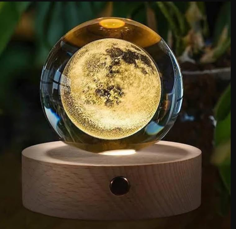 Generic - مصباح ليلي على شكل كرة كريستال بها قمر ثلاثي الأبعاد مع قاعدة خشبية، مصباح كروي مضيء بإضاءة ليد