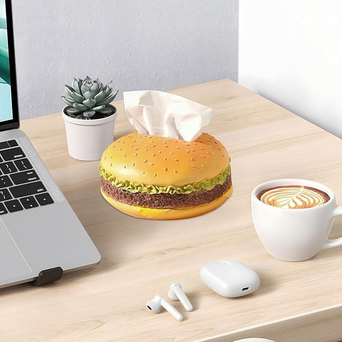 - تصميم مبتكر وجذاب: علبة مناديل بشكل برجر واقعي ثلاثي الأبعاد مع تفاصيل دقيقة تشمل الخبز والخس واللحم لإضافة لمسة عصرية ومرحة لديكور المنزل أو المكتب أو المقهى