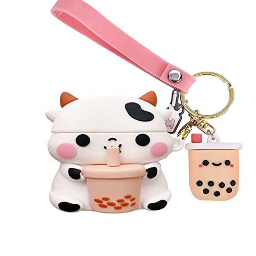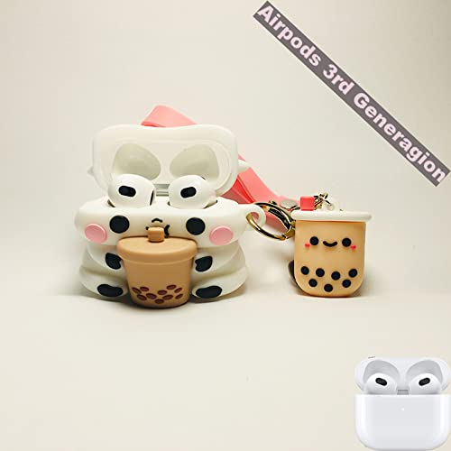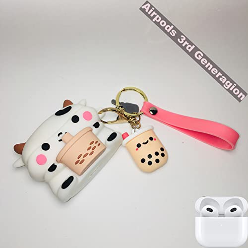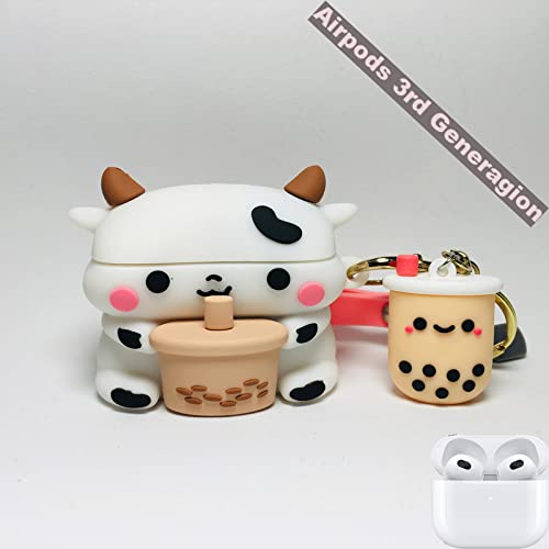 EJOSHELL - جراب حماية سيليكون بتصميم مبتكر ثلاثي الأبعاد على شكل بقرة وشاي بلبن متوافق مع سماعات ايربودز 3 2021 الجيل الثالث، جراب سماعة ناعم على شكل بقرة ومشروب بوبا مع سلسلة مفاتيح للبنات والأولاد