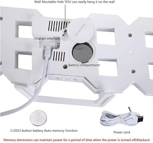 - ساعة ليد متعددة الوظائف: عرض 12 أو 24 ساعة، عرض الوقت/التاريخ، عرض درجة الحرارة، وظيفة التنبيه والغفوة، مصباح ليلي للمكتب أو للتثبيت على الحائط: يحتوي على فتحات في الخلف للتركيب، الحامل قابل للإزالة. بطارية مدمجة لتسجيل الوقت عند انقطاع الطاقة، يتم تشغيل الساعة بواسطة كابل USB فقط.