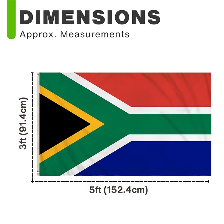 - في كل عبوة، سوف تحصل على علم واحد. يبلغ مقاس كل علم حوالي 5 أقدام × 3 أقدام (91 سم × 152 سم) وهو رائع للاحتفال بيوم جنوب إفريقيا!