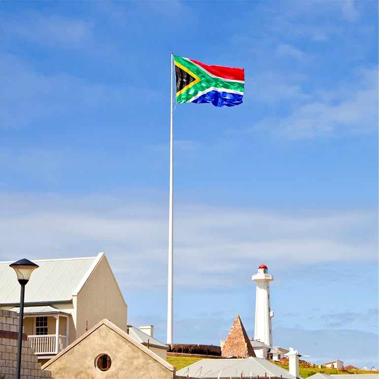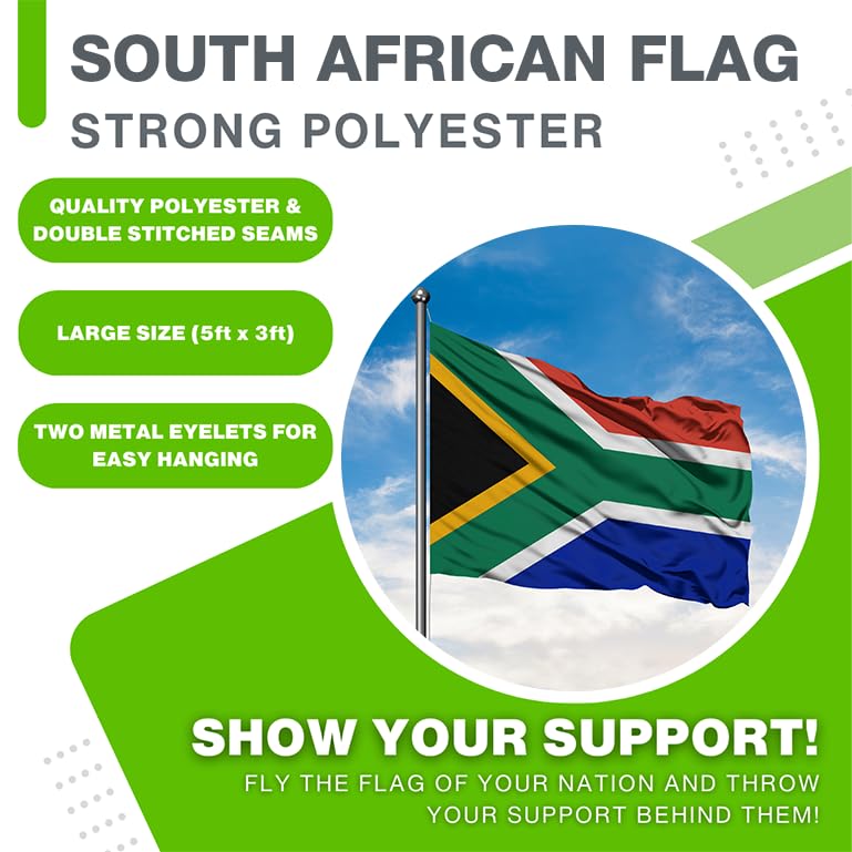 - لوّح بعلم جنوب أفريقيا الوطني الأيقوني عالياً وافتخر بعلم 3 أقدام × 5 أقدام. سواء كنت تشجع فريق كرة القدم الوطني أو تدعم لاعبي الرجبي المفضلين لديك أو تحتفل بالانتصارات الرياضية، فإن علم البوليستر الخاص بنا هو الإكسسوار المثالي للتجمع