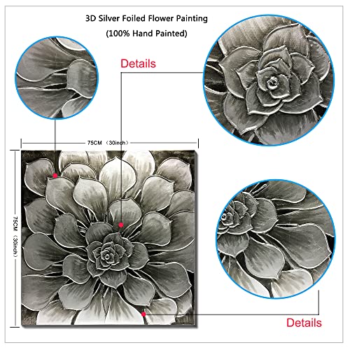 3Hdeko - 3 اتش ديكو - لوحة زيتية تجريدية مرسومة باليد 100% مع رقائق فضية - صورة زهور ثقيلة ثلاثية الابعاد من القماش لديكور المنزل الحديث لغرفة المعيشة وغرفة النوم والمكتب، جاهزة للتعليق (30 × 30 انش)
