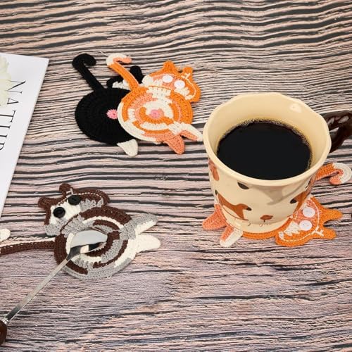 fashion mania - مجموعة قواعد أكواب من نسيج محبوك على شكل قطط مكونة من 3 قطع، هدايا لطيفة لمحبي القطط، هدايا بطابع القطط، قاعدة أكواب لطاولة القهوة والمكتب، اكسسوارات للمكتب
