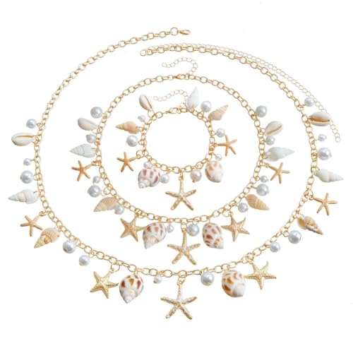 fashion mania - طقم مجوهرات صدف للنساء، اكسسوارات شاطئ صيفية بوهو مع قلادة صدف طبيعي وسلسلة خصر وسوار من 3 قطع
