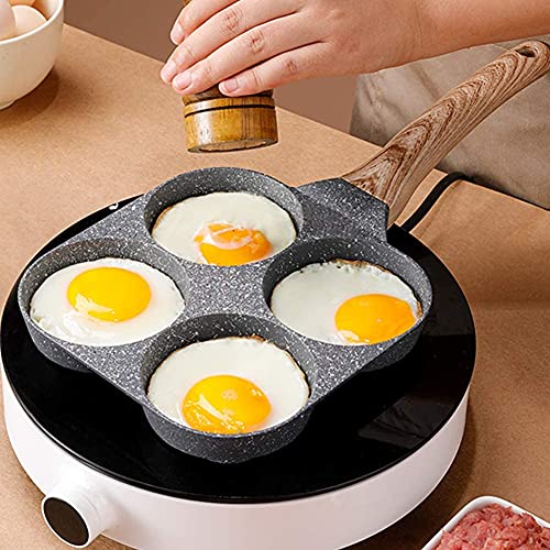 UONE - مقلاة بيض مقلي 4 اكواب، مقلاة غير لاصقة، مقلاة بيض اومليت، وعاء بيض مقلي، مقلاة بان كيك، اداة طبخ للمطبخ، صينية بيض للافطار، وعاء طبخ بدون دخان زيتي (مقبض خشبي)