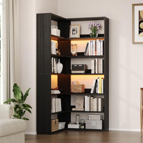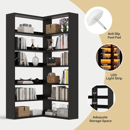4 EVER WINNER - رف كتب زاوية من 4 ايفر وينر مع مصابيح LED، رف كتب كونر مرتفع 71 انش مع مساحة تخزين لغرفة المعيشة وغرفة الدراسة، رف كتب صناعي على شكل حرف L، اسود