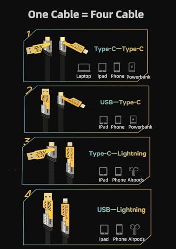 - 🔌 تصميم الكل في واحد: كابل 4 في 1 مع USB نوع C، لايتنينج، Micro USB، USB نوع A لتحقيق أقصى قدر من التوافق.