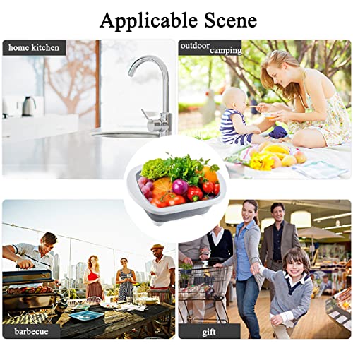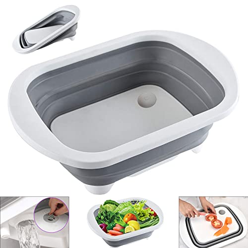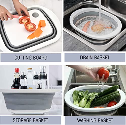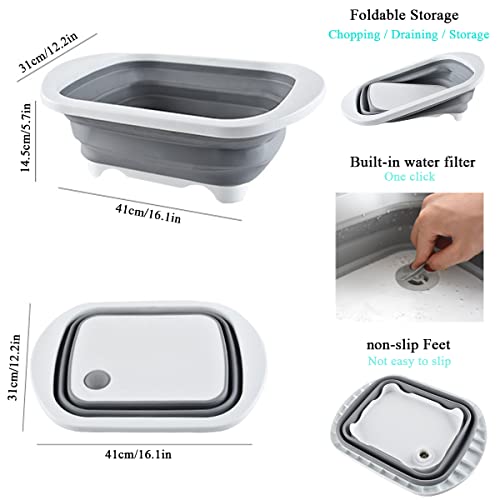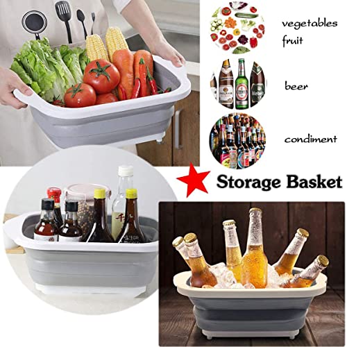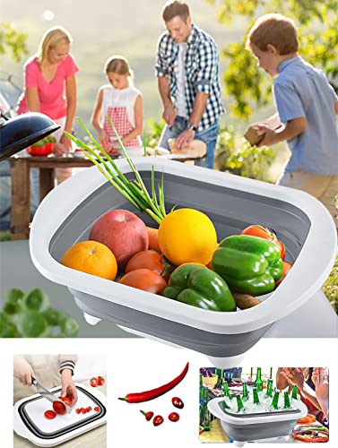 EXMOGO - وعاء غسيل قابل للطي 4 في 1 ولوح تقطيع بلاستيك مع سدادة تصريف ومقابض وسلة تخزين محمولة متعددة الوظائف للتخييم سعة 6 لتر للمطبخ والمنزل والتخييم والنزهات والشواء - لون رمادي