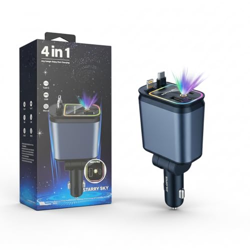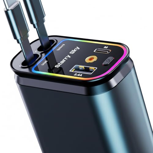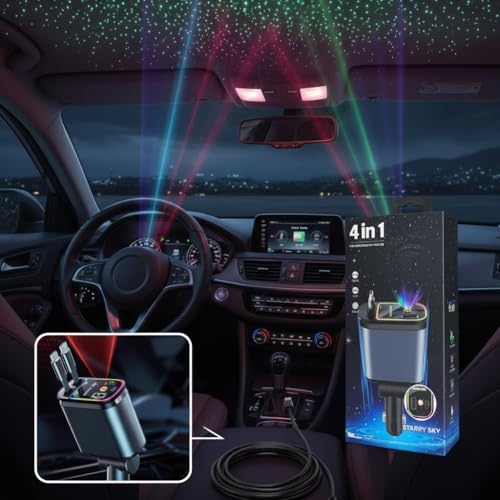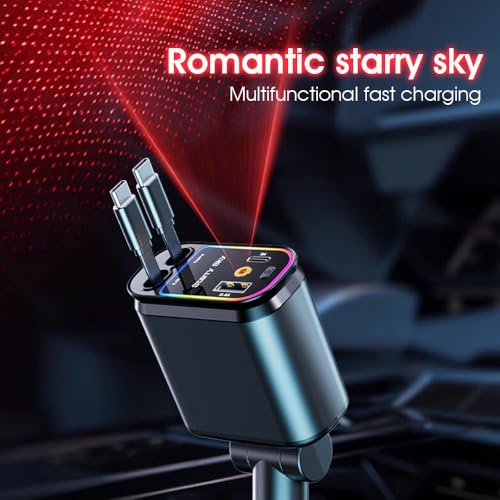 Generic - شاحن سيارة سريع 4 في 1 بقوة 60 وات ليزر كابلات مدمجة قابلة للسحب متوافق مع الهواتف الخلوية، بمنفذين مع بروجيكتور إضاءة سماء النجوم الرومانسية ومنفذ PD شحن فائق السرعة - تصميم منظم وقابل للتعديل