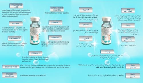 - مجموعة أمبولات سهلة الاستخدام: تحتوي على 4 أمبولات (15 مل تقريبًا لكل منها) لضمان النضارة والفعالية. ببساطة، ضعيها صباحًا ومساءً على بشرة نظيفة مع تدليك لطيف بحركات دائرية لامتصاص مثالي ونتائج رائعة