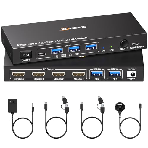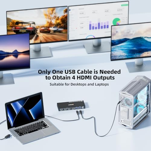 - 【محول كيه في ام اتش دي ام اي 4 شاشات】يحتاج كل جهاز كمبيوتر فقط إلى كيبل USB واحد متصل بمفتاح كيه في ام بشاشة رباعية لتحقيق 4 مخارج شاشات HDMI. يدعم وضع النسخ المتطابق والوضع الممتد، يمكن للابتوب إخراج ما يصل إلى 5 شاشات متطابقة أو مختلفة. التبديل بنقرة واحدة بين أجهزة الكمبيوتر الشخصية والعمل