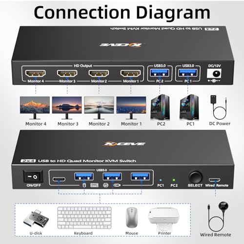 - 【يلزم تركيب برنامج التشغيل للتعرف على الشاشات؛ (2) لكي يعمل مفتاح كيه في ام بشاشة رباعية جهازي كمبيوتر بشكل صحيح، يجب أن يكون نظام الكمبيوتر 11 أو أعلى؛ (3) كابلان USB 3.0 في العبوة، ولكن كيبلات HDMI غير متضمنة. (4) لا يدعم محاكاة EDID وتبديل مفتاح الاختصار. إذا كان لديك أي أسئلة، يرجى إخبارنا، سيقوم فريقنا الفني بالرد عليك في غضون 12 ساعة.
