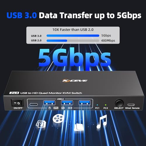 - 【محول كيه في ام بشاشة رباعية مع 4 منافذ USB3.0】محول كيه في ام 4 شاشات مزود بـ 4 منافذ USB 3.0 لتوصيل الكيبورد والماوس والطابعة والمزيد. مع معدل نقل بيانات يصل إلى 5 جيجابايت في الثانية، توافق مع الإصدارات السابقة مع USB 1.1/2.0.
