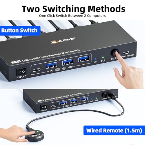- 【توافق واسع وطريقتان للتبديل】محول كيه في ام يو اس بي إلى اتش دي ام اي متوافق بسهولة مع ويندوز وماك او اس. يدعم طريقتين للتبديل - الزر الفعلي وجهاز التحكم عن بعد السلكي - بينما تعرض مؤشرات LED الكمبيوتر النشط بوضوح.