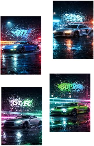 Generic - 4 لوحات فنية مقاس 30*20 مغلفة بوستر ملصقات سيارات لا يوجد إطار صورة سيارات بورش 911 - سوبره - GTR - اودي روس