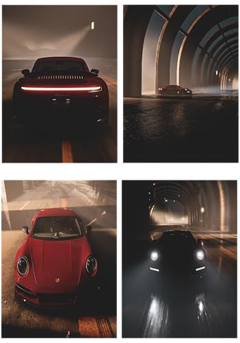 Generic - 4 لوحات فنية مقاس 30*20 مغلفة بوستر ملصقات سيارات لا يوجد إطار صورة سيارات بورشة لونه احمر