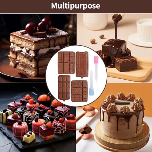 MIHURO - قوالب شوكولاتة من السيليكون غيرعميقة مع قطارتين، قوالب خبز غير لاصقة قابلة لإعادة الاستخدام مناسبة للحلوى وألواح البروتين والطاقة، والشوكولاتة على شكل قلب ونقشة مربعات، والوافل والجيلي، 4 قطع