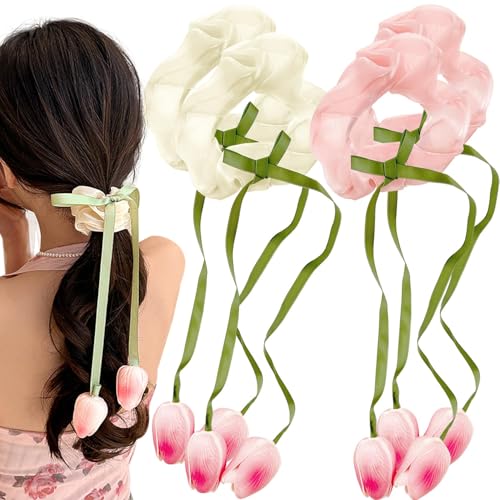 Auswalar - توك شعر كبيرة على شكل زهور من الشيفون مناسبة لتسريحة ذيل الحصان للنساء والبنات، اكسسوارات شعر بتصميم للشعر الكثيف والطويل والمجعد، مجموعة من 4 قطع