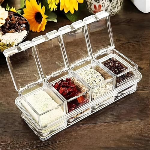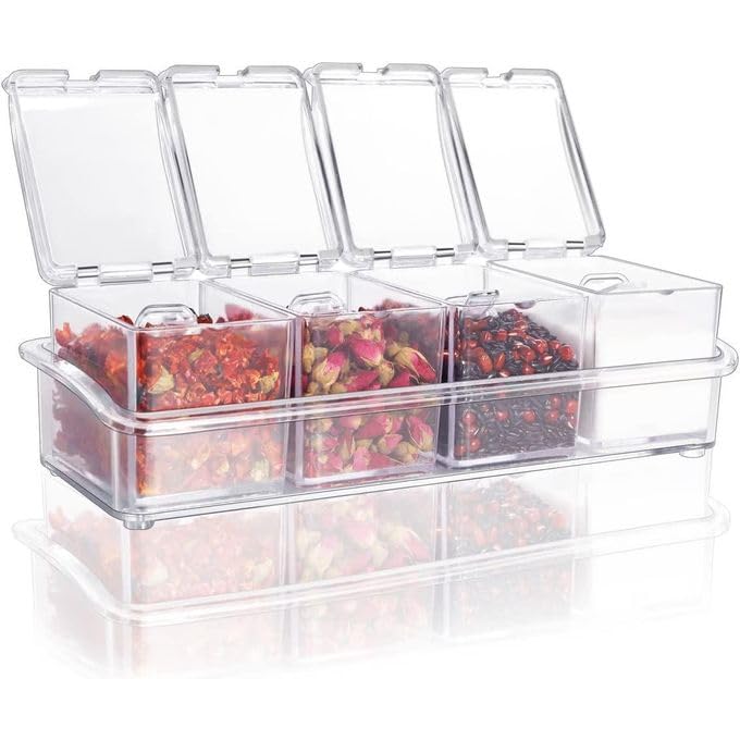 Generic - طقم توابل أكريليك شفاف 4 قطع مع حامل ومنظم ومع معالق لكل عبوة لتخزين التوابل اليومية بشكل مرتب وسهل الوصول لكل المطابخ العصرية