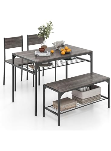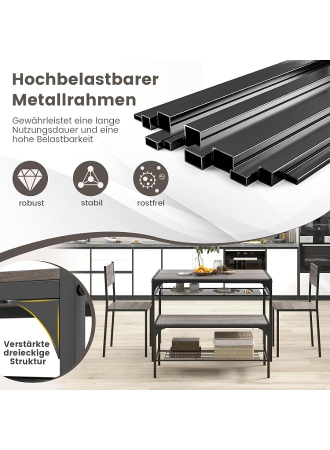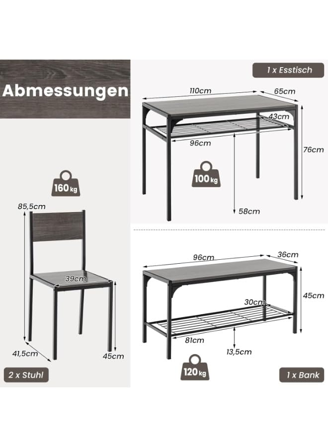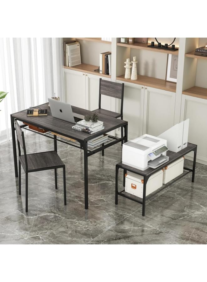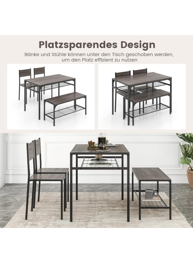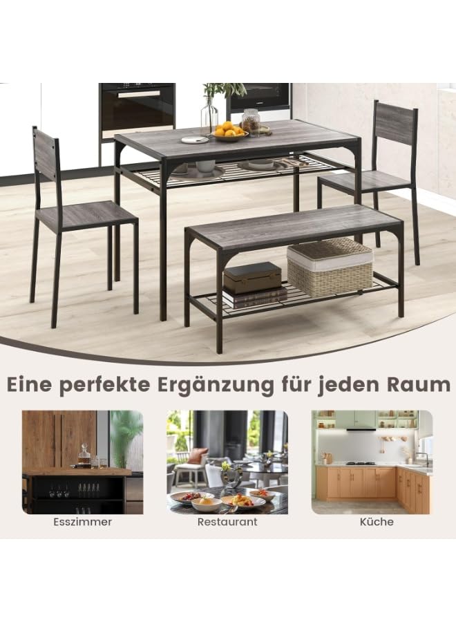 Generic - طقم طاولة طعام صناعية من 4 قطع مع كرسيين ومقعد، رمادي، اطار معدني مع ارفف تخزين، مستطيلة، تصميم موفر للمساحة للشقق الصغيرة
