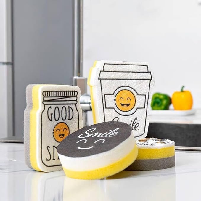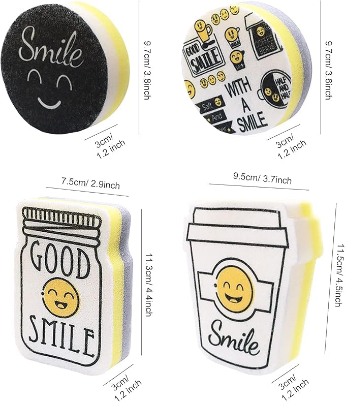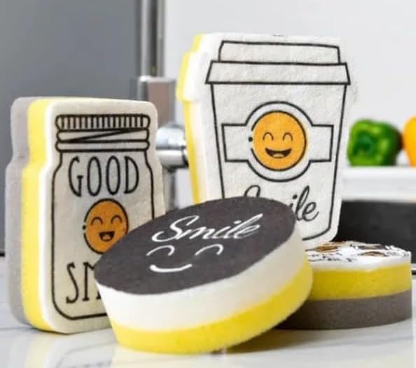 - محتوى المجموعة: طقم مكون من 4 قطع إسفنجية للتنظيف بتصاميم مختلفة ومميزة تشمل أشكال الابتسامة والعبارات التحفيزية