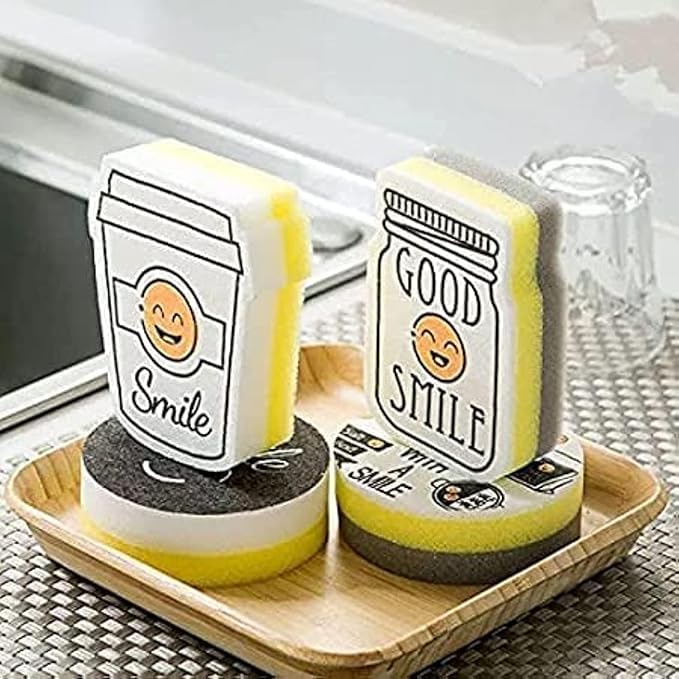 Generic - طقم اسفنج تنظيف للمطبخ 4 قطع برسومات مبتسمة أنيقة، مناسب للاستخدام اليومي ويوفر قوة تنظيف عالية مع حماية للأسطح