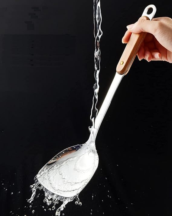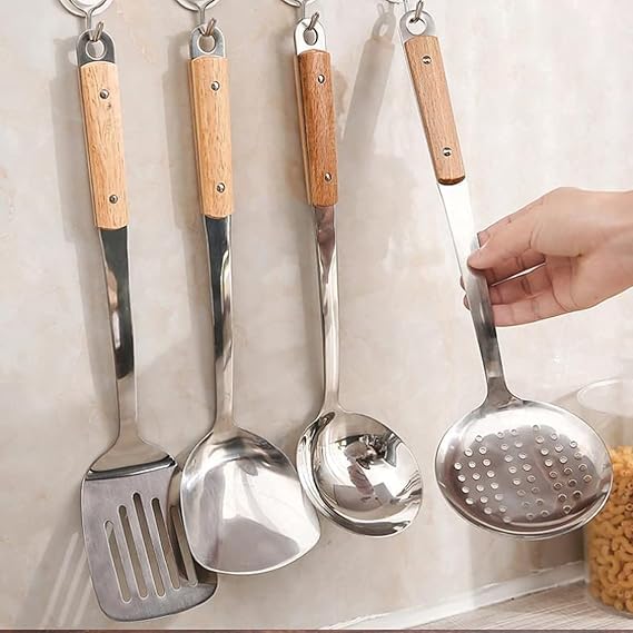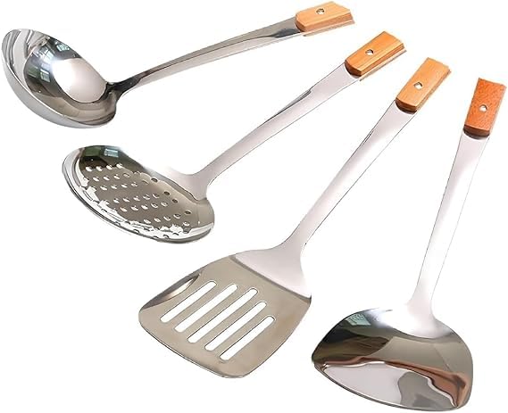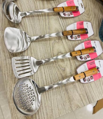 Generic - مجموعة أدوات للطهي للمطبخ من الفولاذ المقاوم للصدأ بمقبض خشبي، مجموعة ملعقة سباتولا مع خطاف ومجرفة ومغرفة تقليب مشقوقة ومقصوصة ومغرفة من 4 قطع