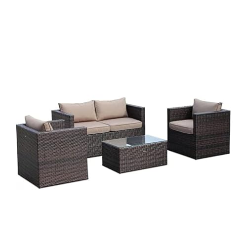 Generic - طقم أثاث فناء خارجي مكون من 4 قطع، كنبة راتان من الخوص مع ترابيزة قهوة زجاج، بني وبيج