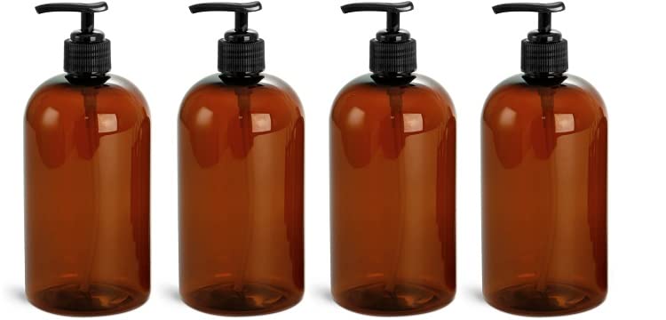 Bottles N Bags - زجاجات شامبو قابلة لإعادة الملء مع مضخة، زجاجات بلاستيكية 473 مل مع موزع مضخة، حاويات استحمام قابلة لإعادة الملء للصابون واللوشن وما الى ذلك، خالية من البيسفينول أ، لون كهرماني 473 مل (4 عبوات)
