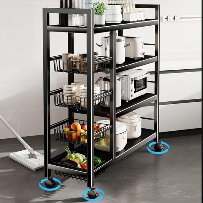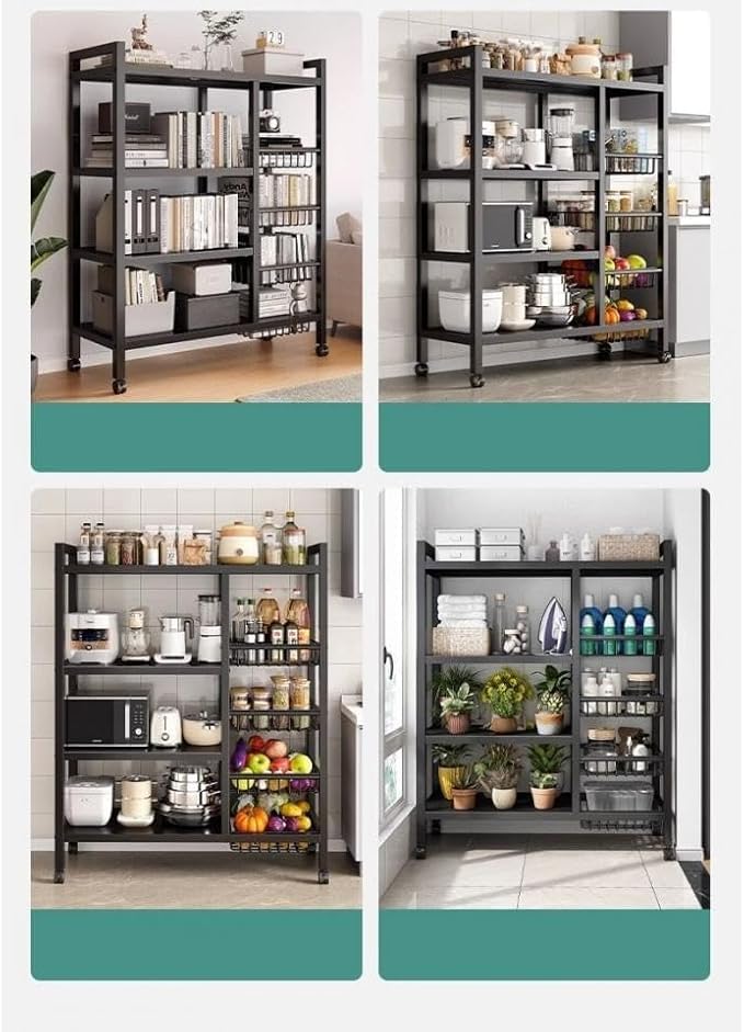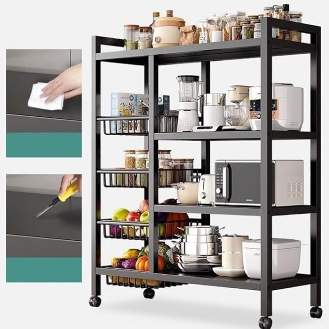 - تصميم متعدد الاستخدامات: تتميز بـ 4 طبقات من مساحة التخزين مع مزيج من الأرفف المسطحة والسلال السلكية، مثالية لتنظيم المطبخ وتخزين العناصر المختلفة