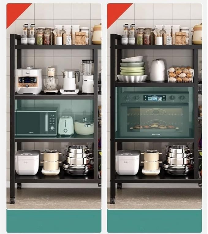 - هيكل قوي: مصنوع بإطار معدني متين بلمسة نهائية سوداء أنيقة، مما يوفر دعمًا موثوقًا لأجهزة المطبخ وأدوات التخزين
