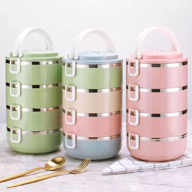 Generic - صندوق غداء حراري من 4 طبقات من الستانلس ستيل، لتخزين الطعام قابل للتكديس، تصميم مقبض، الوان بينك واخضر ورمادي