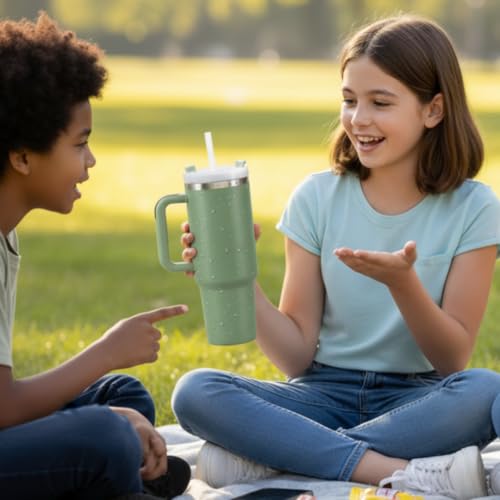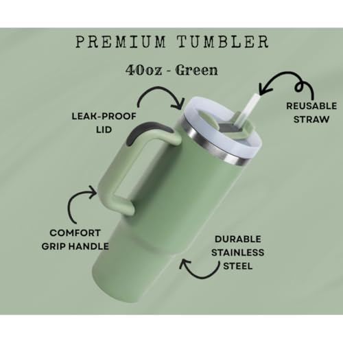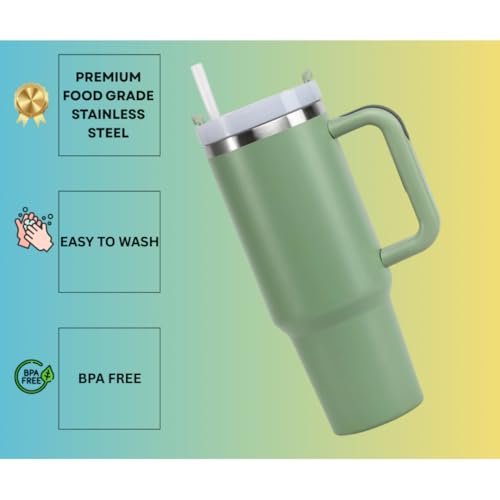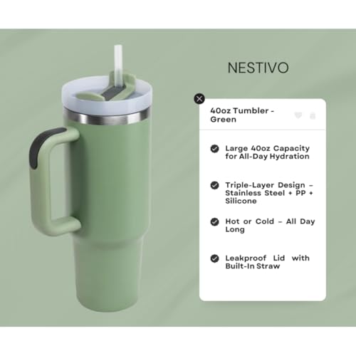 NESTIVO - كوب ستانلس ستيل 40 اونصة مع مقبض وماصة - كوب سفر معزول بغطاء مانع للتسرب، كوب ماء قابل لاعادة الاستخدام، اخضر وكريمي، بولي بروبلين + سيليكون متين، يحافظ على المشروبات ساخنة وباردة (اخضر)
